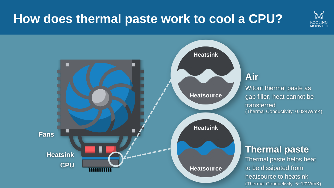 サーマルペーストは、CPU や GPU などの電子部品の冷却において重要な役割を担う不可欠な物質です。ヒートシンクとプロセッサ間の微細な隙間を埋めて熱伝導を強化し、発生した熱を効率よく逃がして最適な温度を維持できるよう、特別に設計されています。(詳しくは サーマルペーストとは何か? を参照)