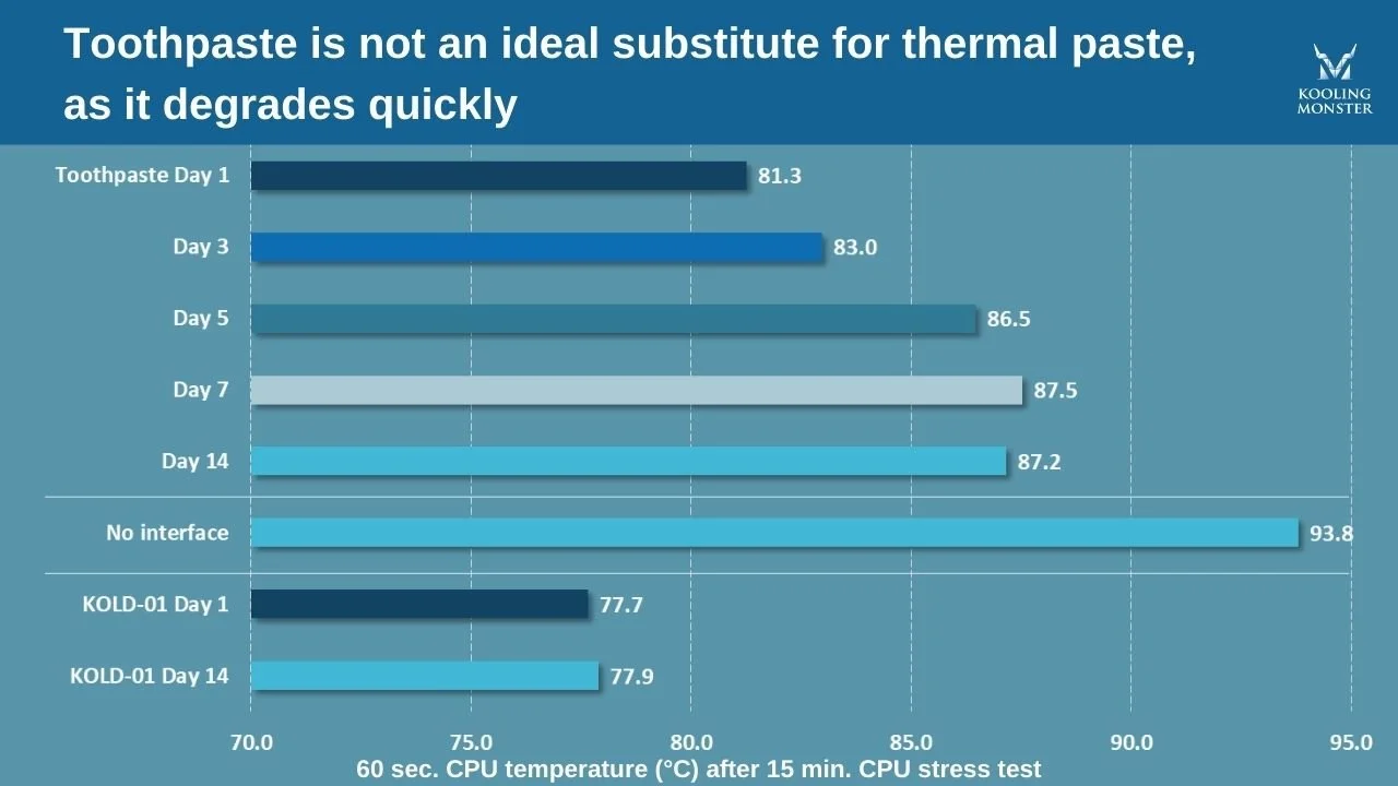 PCのCPUに対する熱伝達材として歯磨き粉がどの程度効果的か、実験を行いました。塗布から1週間後、冷却性能の大幅な低下が確認され、CPU温度は81.3℃から87.5℃まで上昇しました。熱伝達材なしの状態(93.5℃)よりは多少マシでしたが、KOLD-01のような高品質サーマルペーストがCPU温度を約77.7℃に保ったのと比べると、はるかに劣っていました。
