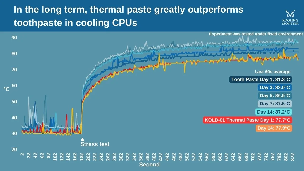 結果は明白でした。7日後、歯磨き粉の熱伝達性能は大きく低下し、CPU温度は81.3℃から87.5℃まで上昇してそこで頭打ちになりました。一方、サーマルペーストは一貫した性能を維持し、CPU温度は約77.8℃で安定していました。つまり、歯磨き粉は短期的な応急処置としては使える可能性があっても、長期的にサーマルペーストの代わりにはなりません。
