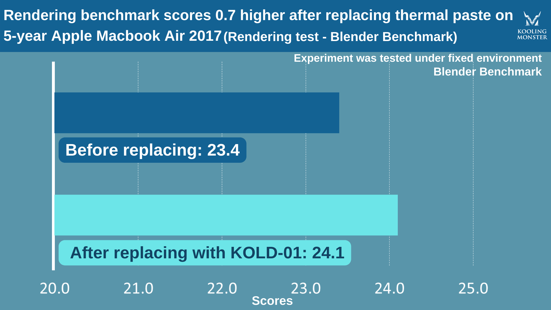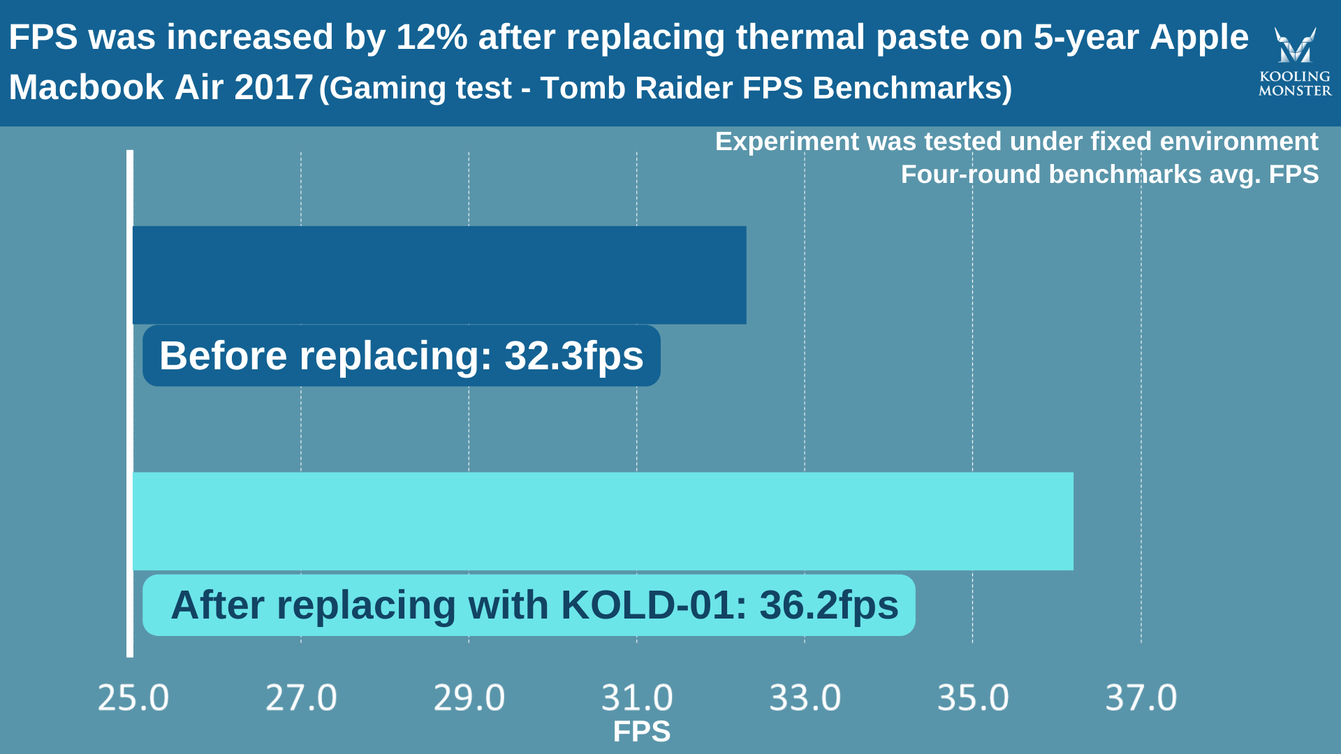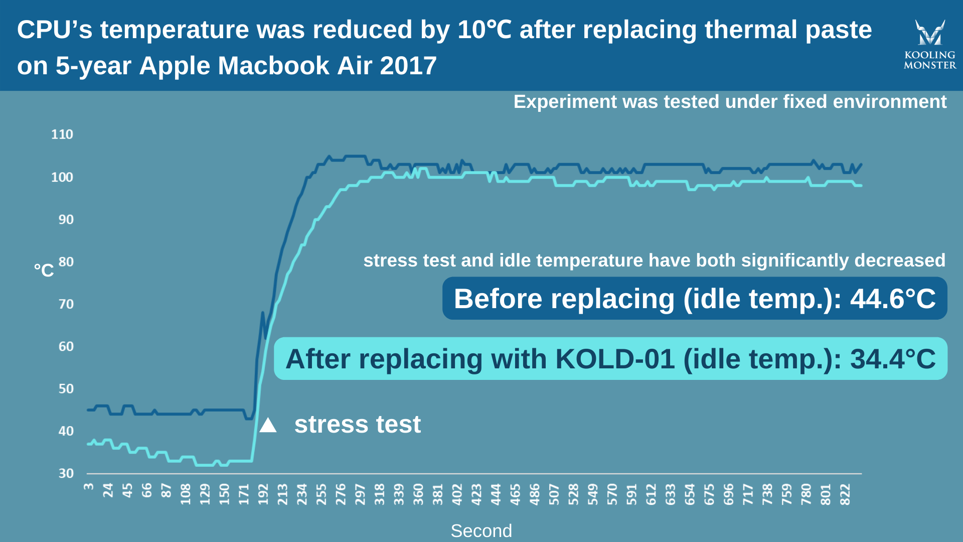 より分かりやすくするために、5年使用した Apple MacBook Air 2017 で、新しいサーマルペーストを塗布する前後にストレステストを実施しました。このテストには、自社製の Kooling Monster KOLD-01 サーマルペーストを使用しています。