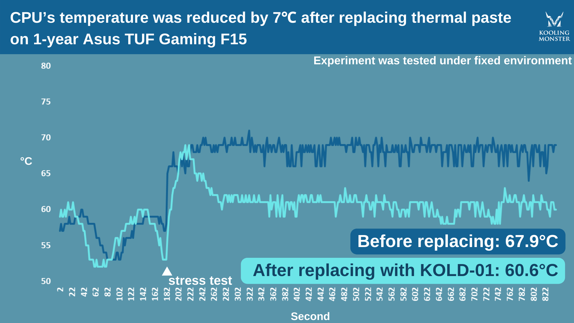 効果をより分かりやすくするため、1年使用したAsus TUF Gaming F15でサーマルペースト交換前後にストレステストを実施しました。このテストでは自社製のKooling Monster KOLD-01サーマルペーストを使用しました。