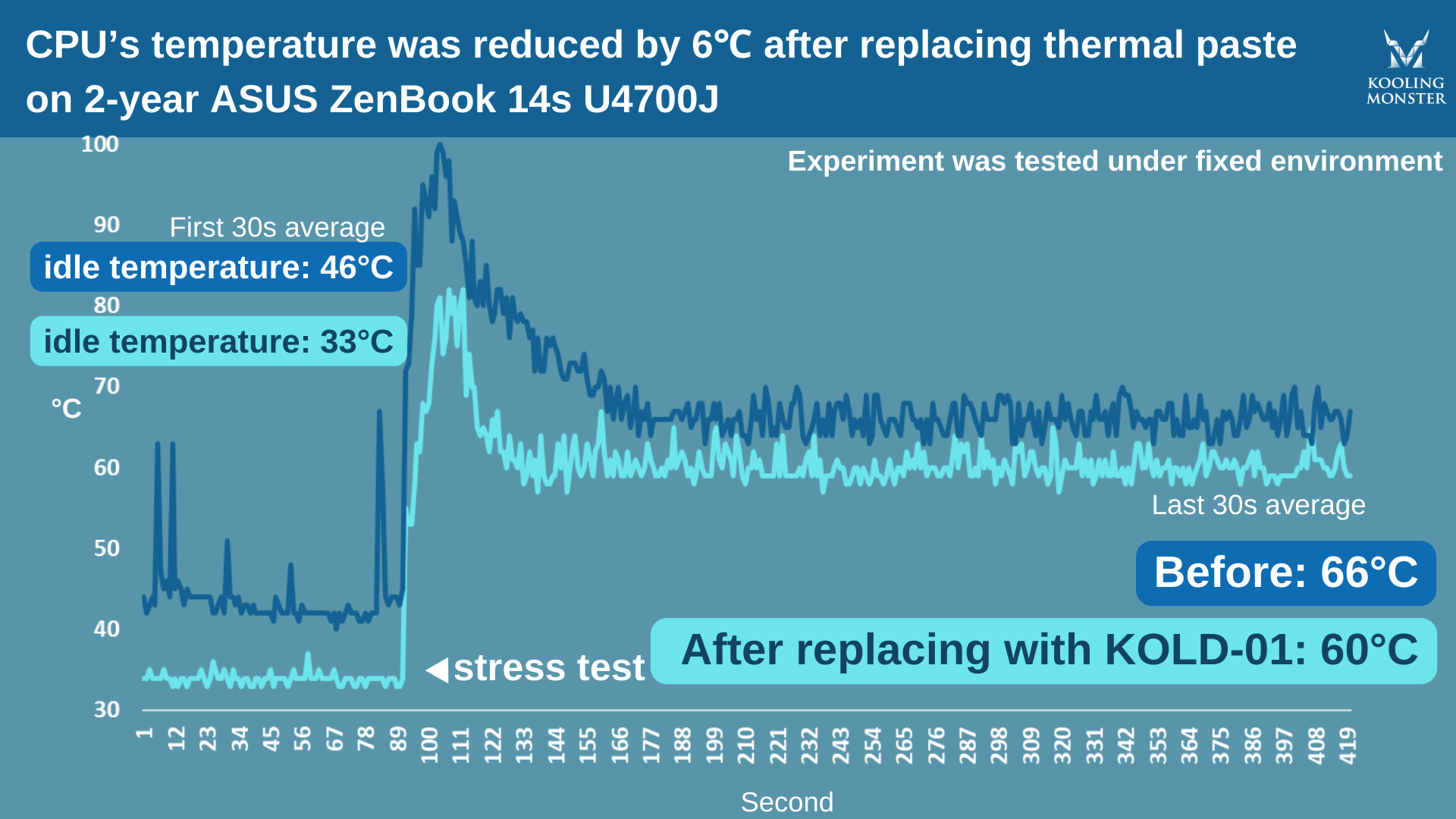 より分かりやすくするために、2年使用した ASUS ZenBook 14s U4700J で、新しいサーマルペーストを塗布する前後にストレステストを実施しました。このテストには、自社製の Kooling Monster KOLD-01 サーマルペーストを使用しています。