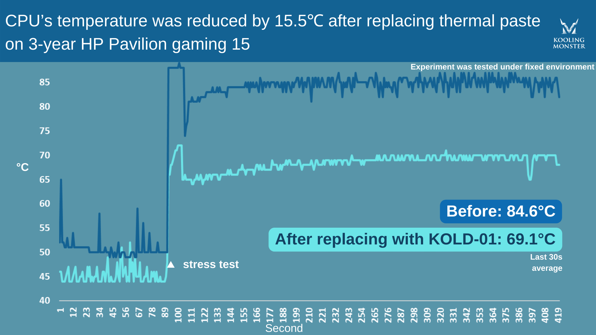 わかりやすくするため、3年使用のHP Pavilion Gaming 15で、新しいサーマルペースト塗布の前後にストレステストを実施しました。このテストでは当社のKooling Monster KOLD-01サーマルペーストを使用しました。