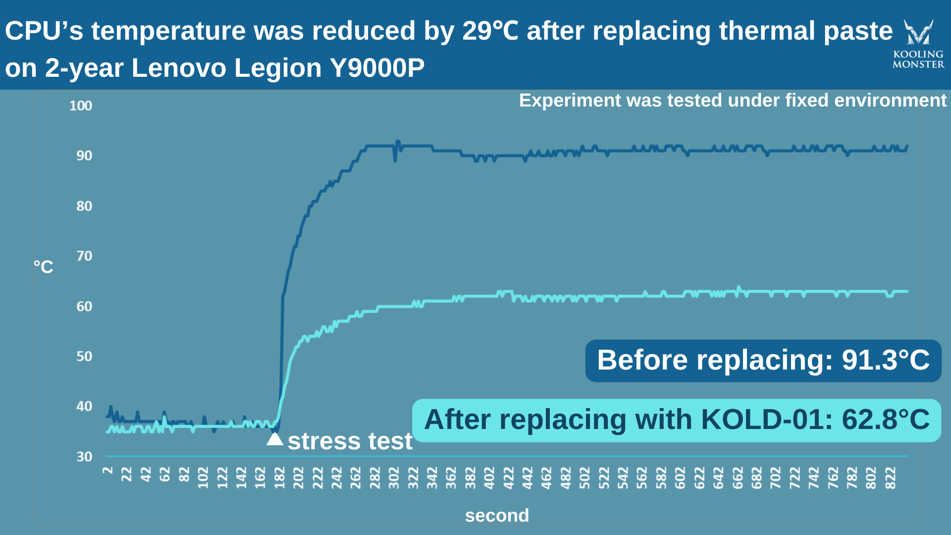 効果をより分かりやすくするため、2年使用したLenovo Legion Y9000P 2021Hでサーマルペースト交換前後にストレステストを実施しました。このテストでは自社製のKooling Monster KOLD-01サーマルペーストを使用しました。