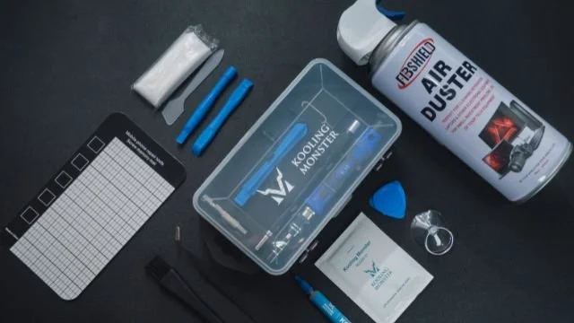 開けたあとは、ファンや他のハードウェアパーツを掃除するための追加のクリーニング道具も必要です。小さなブラシとエアダスター(またはエアブロワー)などが含まれます。